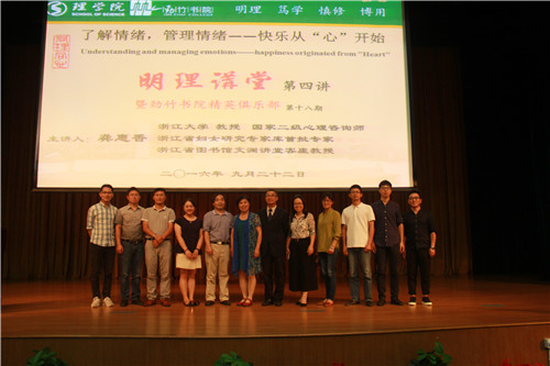 9月22日晚,“明理讲堂”第四讲在安吉校区活动中心的小剧场举行。浙江大学教授、国家二级心理咨询师龚惠香教授以现代老员工心理素养和情绪变化为主题,给大家带来了一场心灵盛宴。董事长助理、安吉校区党工委书记鲁伟权、600全讯白菜经理陶祥兴、党委副书记王杨、部分教师代表、辅导员以及600全讯白菜16级全体新生参加了本次讲座。讲堂由董事长助理、安吉校区党工委书记鲁伟权主持。