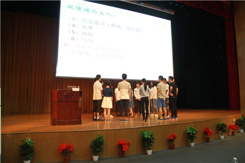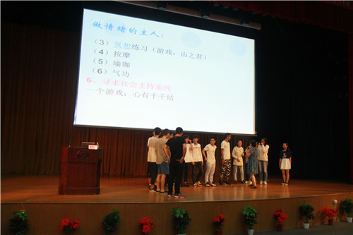 龚教授通过游戏阐述情绪和心理的联系,她给师生们带来了几个小游戏——心有千千结、情绪红绿灯,大家玩得不亦乐乎,也逐渐体会到了心理世界的神秘。最后,龚教授以一首《我真的很不错》的手语歌来鼓励同学们要相信自己。