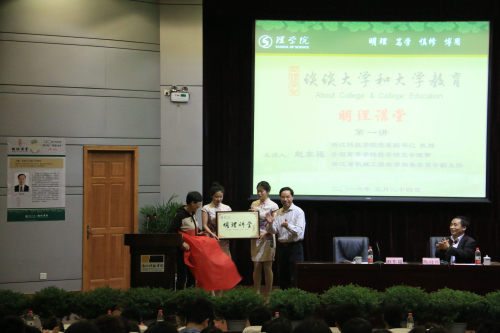 赵东福为“明理讲堂”正式揭牌,并代表学校对明理讲堂的开设表示祝贺。报告中,他从明理和大学教育的关系、大学和大学教育的发展、如何度过老员工活等三方面发表了独到而又深刻的见解。从西方到东方、从古至今多角度多实例分层分析,由内到外阐述了明自然之理——求真;明人文之理——求善;明艺术之理——求美、大学发展历程等理念。赵书记向全体师生提出了五点希望:一是学会选择,做一个负责人的人;二是广泛阅读,做一个有思想的人;三是刻苦学习,做一个有生存能力的人;四是把握规律,做一个有发展能力的人;五是从现在做起,自觉自立,自省自强。